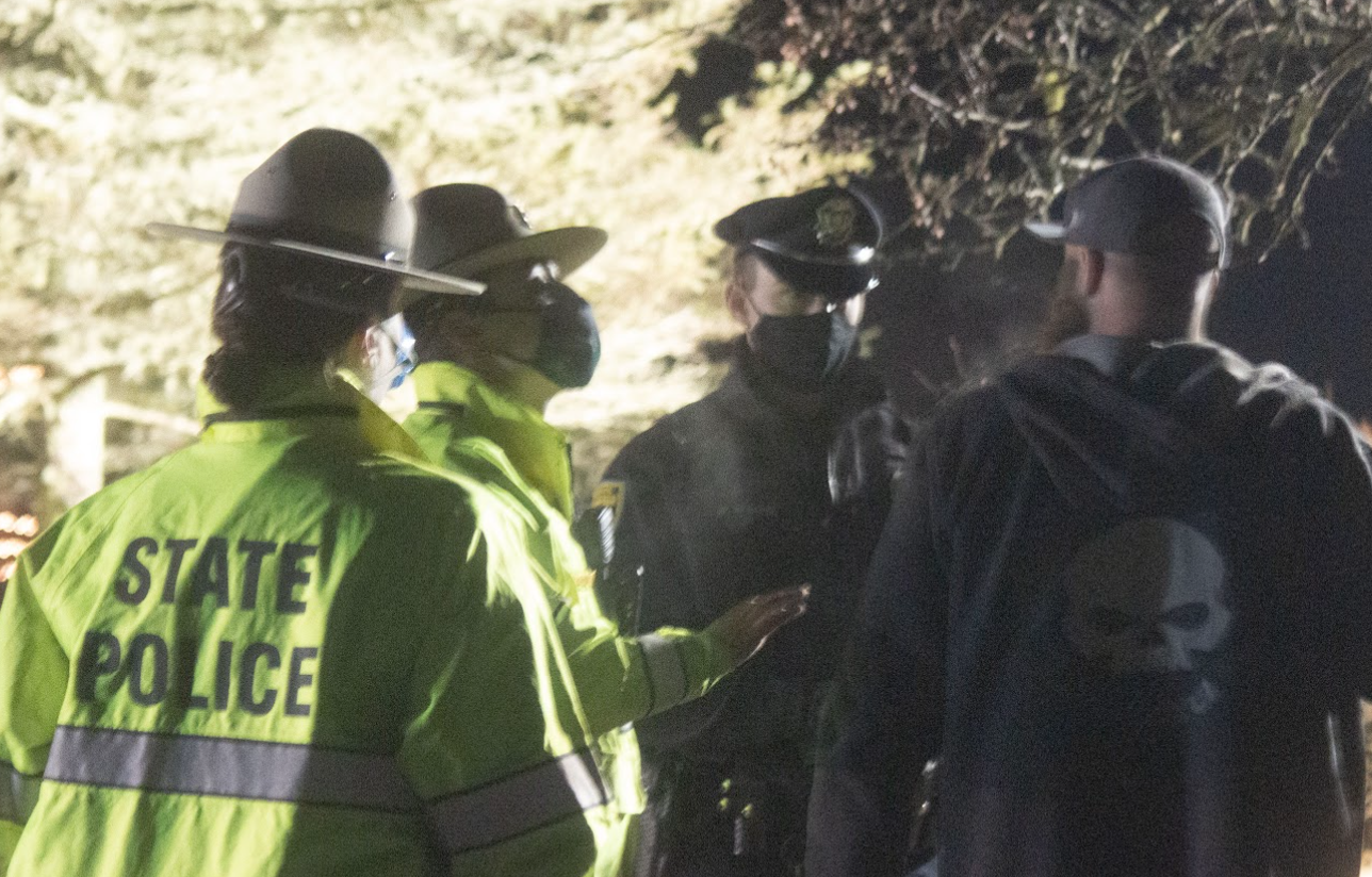 They continued their impromptu march back up the street and around the cul-de-sac, where troopers again engaged them. Another dozen state police vehicles then rolled in, with some officers in riot-gear helmets and carrying batons.