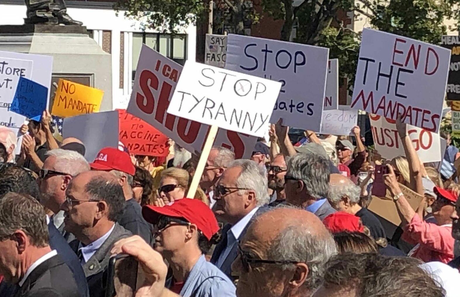 “Where is Sununu?” was the most frequently heard cry of the morning, along with shouts of “coward” and “loser.” Many in the crowd wanted to know why Gov. Chris Sununu wasn’t being more aggressive in opposing the mandate, like Republican Govs. Greg Abbott (Texas) and Ron DeSantis (Fla.).