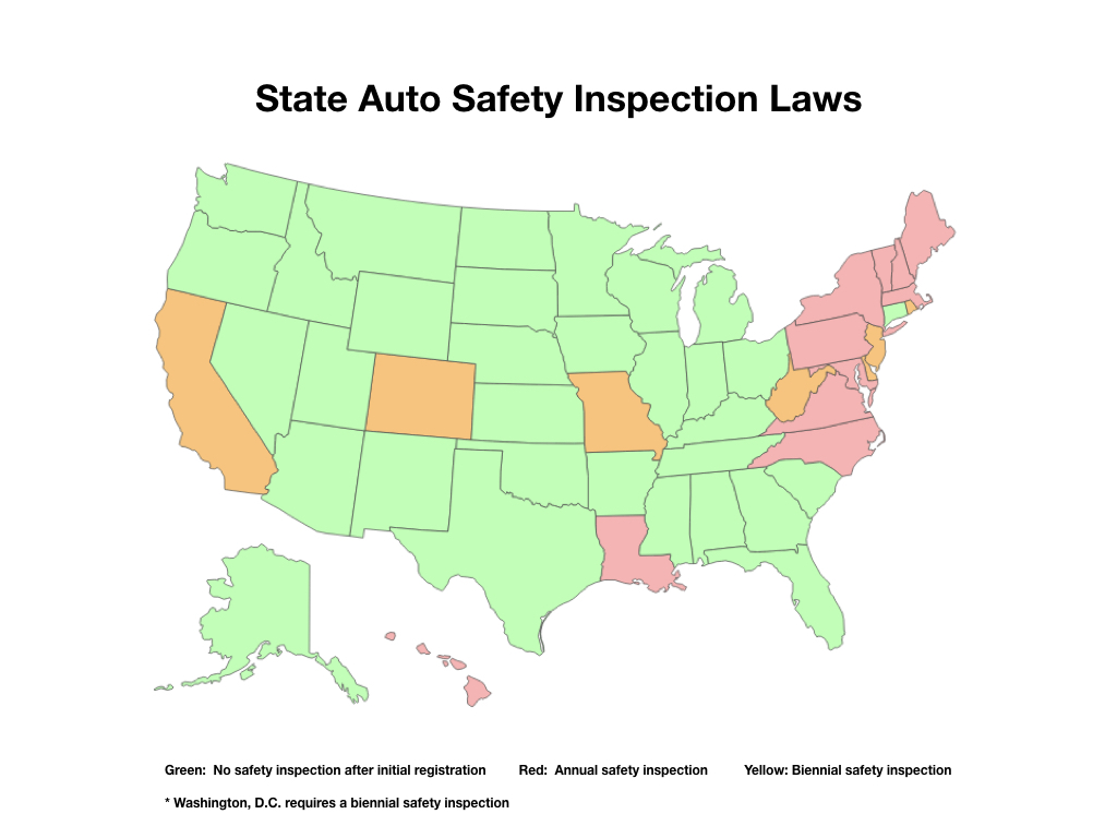 Of the 11 states (by our count) that require annual auto safety inspections (not emissions inspections), nine are clustered on the Eastern seaboard, running from North Carolina to Maine. Only Hawaii and Louisiana are outside of this stretch of original American colonies.