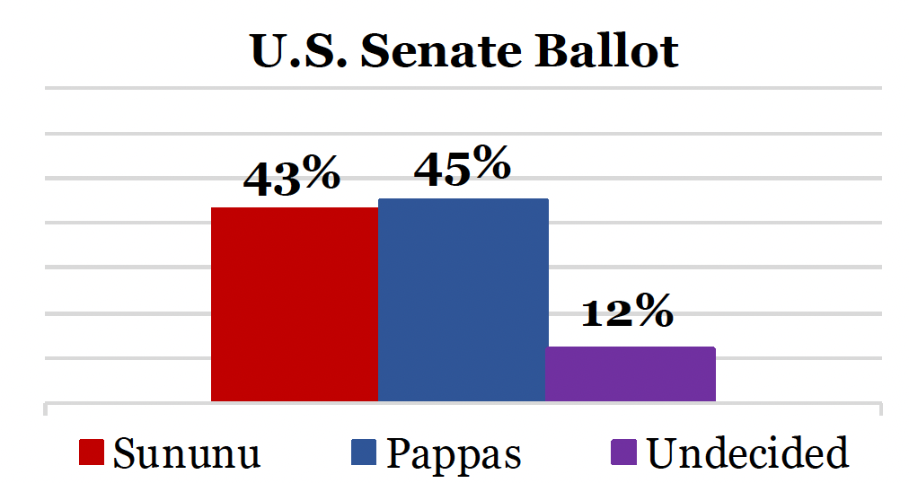 • • Among voters who have “heard of both” candidates, Sununu and Pappas are tied 45-45%. Among voters who have an “opinion of both” candidates, Sununu would lead 47-46% (+1%).