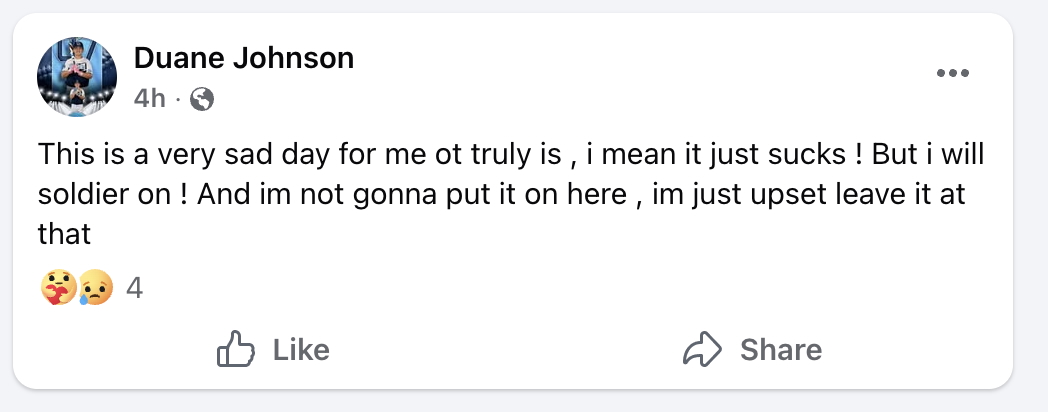On Monday, Johnson posted a vague statement on his Facebook account. “This is a very sad day for me ot truly is, i mean it just sucks ! But i will soldier on ! And im not gonna put it on here , im just upset leave it at that [sic],” Johnson wrote.