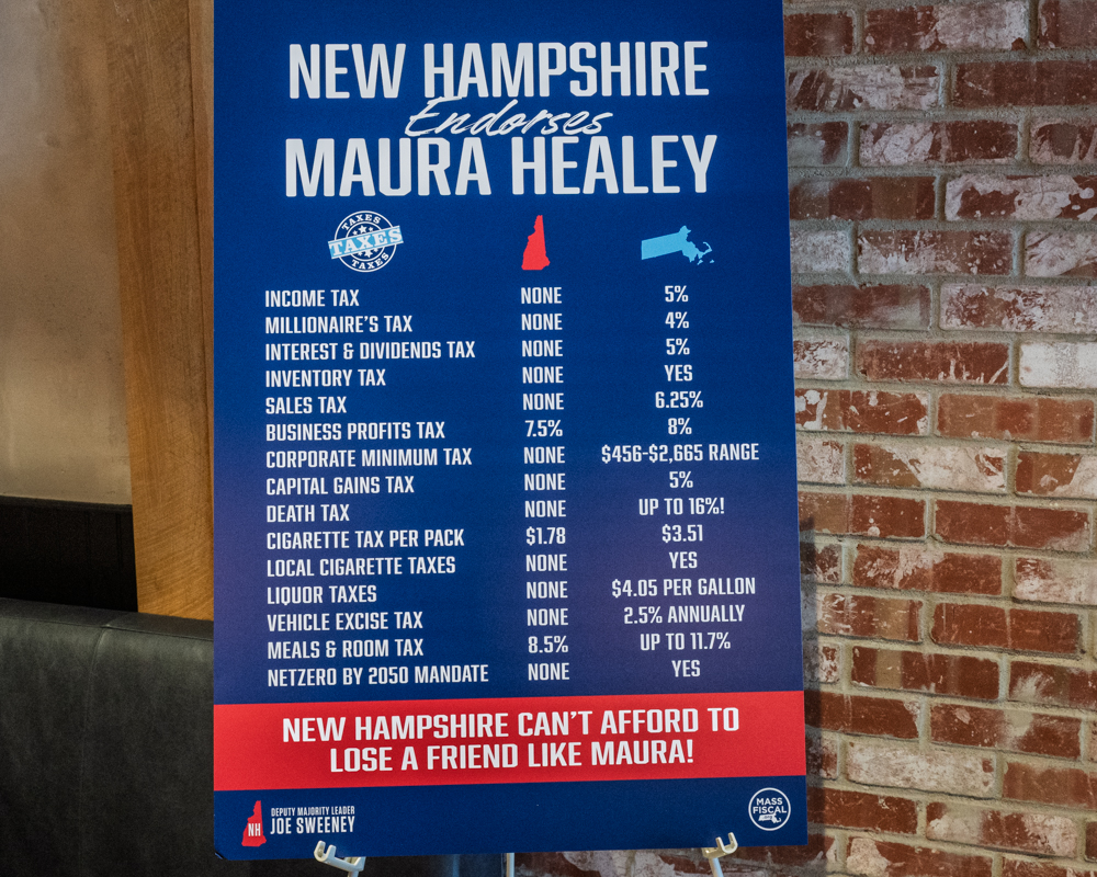 Both press conferences featured a chart listing 15 New Hampshire tax advantages over the Bay State, including no income or sales taxes, no capital gains tax, and no vehicle excise tax.